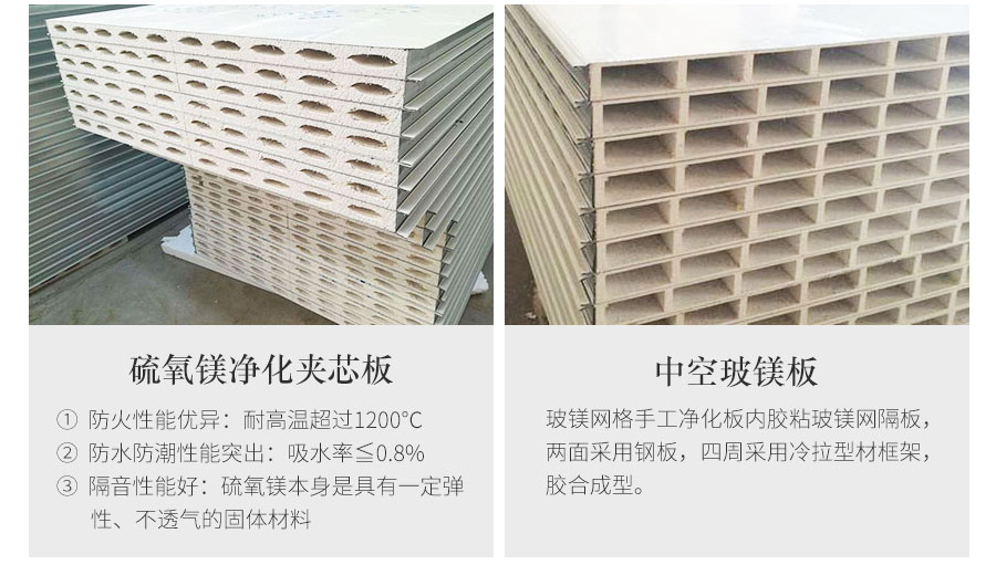 3,芯板與彩涂鋼板的粘合度高(不會產生脫膠現象)。硫氧鎂凈化夾芯板的硫氧鎂芯材采用板條式與彩涂鋼板相連接,具有很好的獨立粘結性,從而很好的解決了當前市場上以整板形式與鋼板復合,而導致脫膠現象。